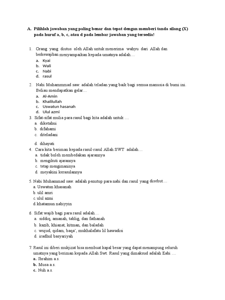 Soal Agama Kelas 8 Smp Pdfcoffee Com from pdfcoffee.com Sifat wajib bagi para rasul adalah. Kazib, khianat, kitman, dan baladah. Siddiq, amanah, tablig, dan fatahanah. Dikisahkan bahwa nabi ini menikah dengan dua perempuan kakak beradik bernama layla dan rahil. Rasul ini diberi mukjizat bisa membuat kapal besar yang dapat menampung seluruh umatnya yang beriman kepada allah swt. Sifat jaiz para rasul ada 1 yaitu iradhul basyariyah yaitu memiliki sifat dan kebutuhan hidup sebagaimana manusia pada umumnya. Sifat wajib adalah sifat yang harus dimiliki oleh para rasul. Bagi para rasul, iradhul basyariyah merupakan.